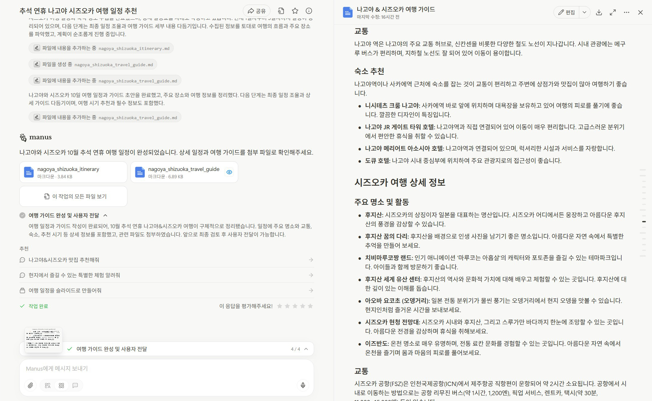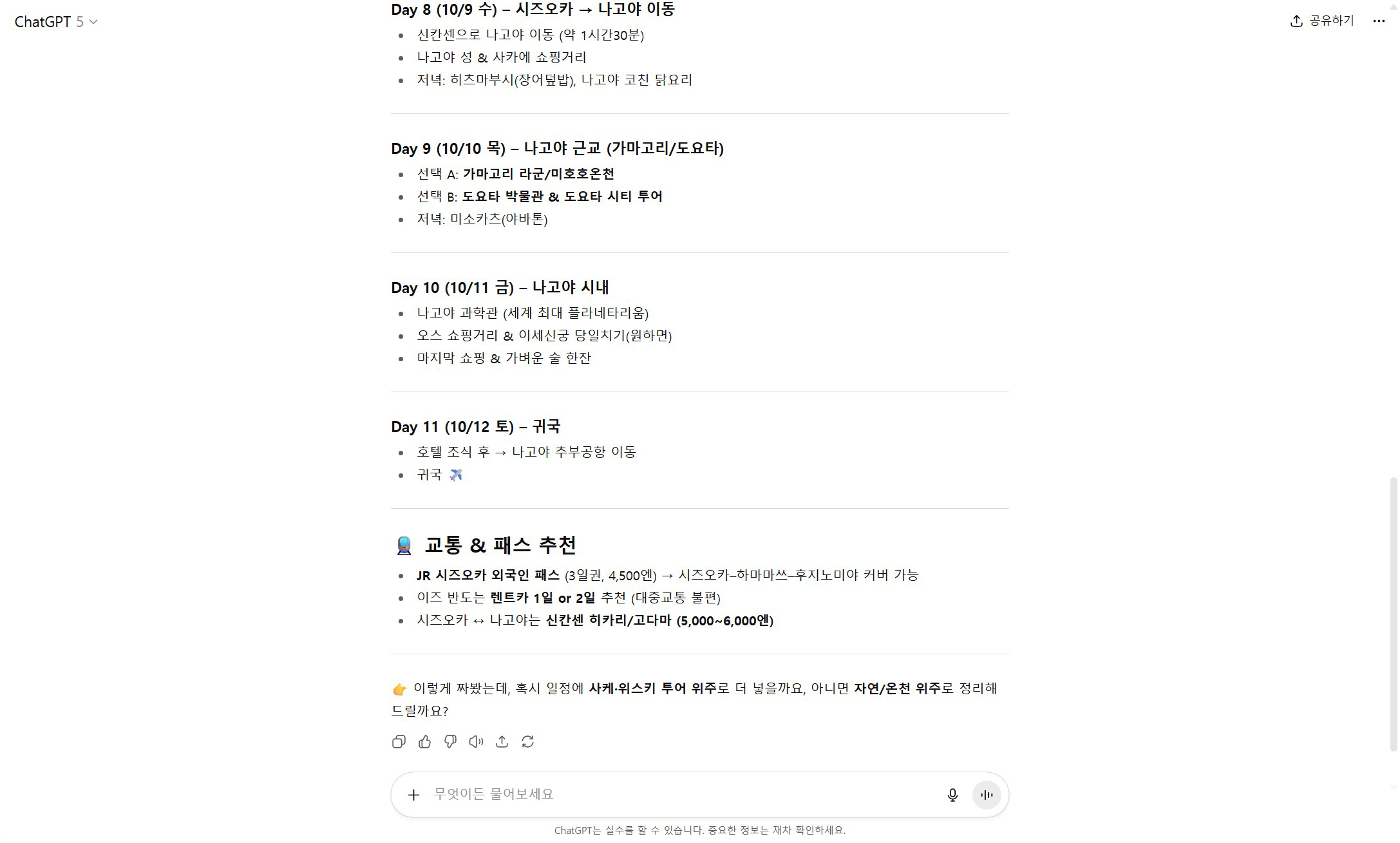 - 입력: “10/3~10/12 일정으로 일본 나고야·시즈오카 여행 플랜 계획해줘.”