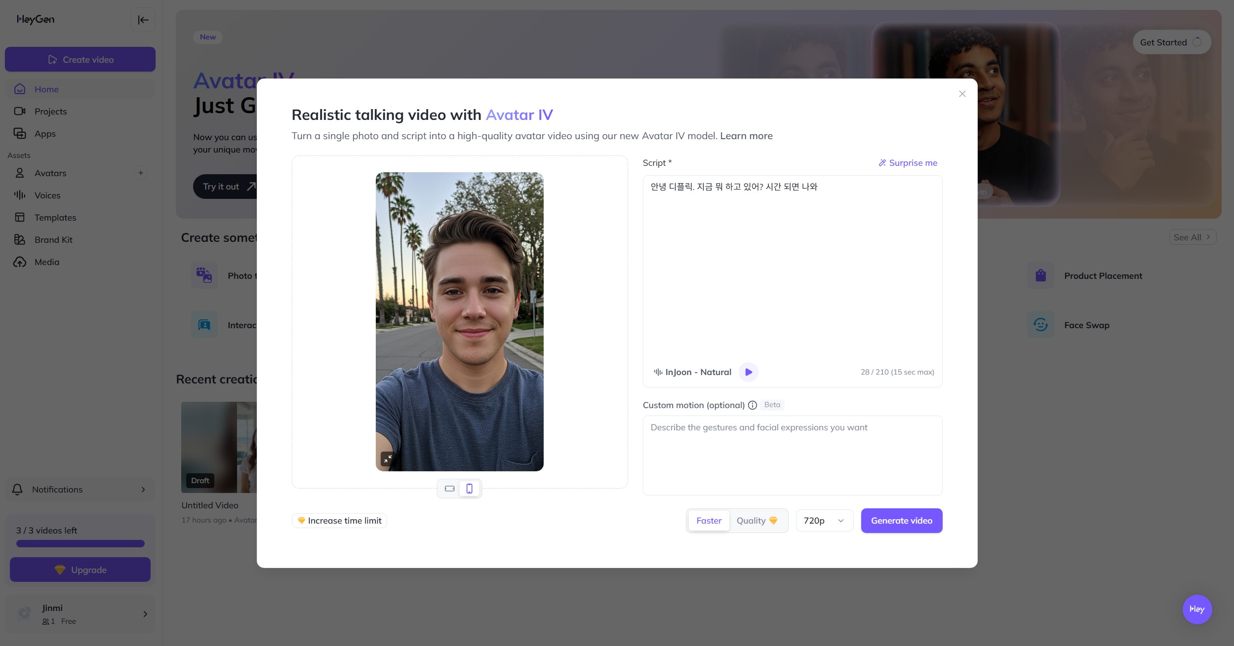 이럴 때 딱인 게 AI 아바타 영상이죠. 사진 + 스크립트만 넣으면 OK!