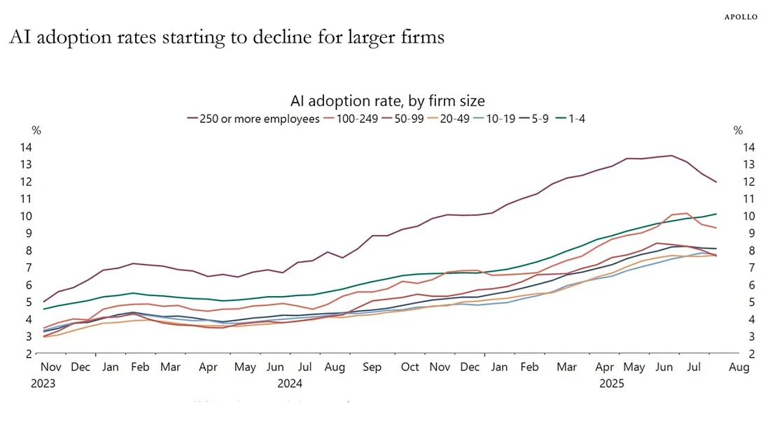 2023년 11월~2025년 8월 기업 규모별 AI 도입률 변화. 대기업은 점점 도입률이 감소하고, 소기업은 지속적으로 증가하는 추세다. ©Medium