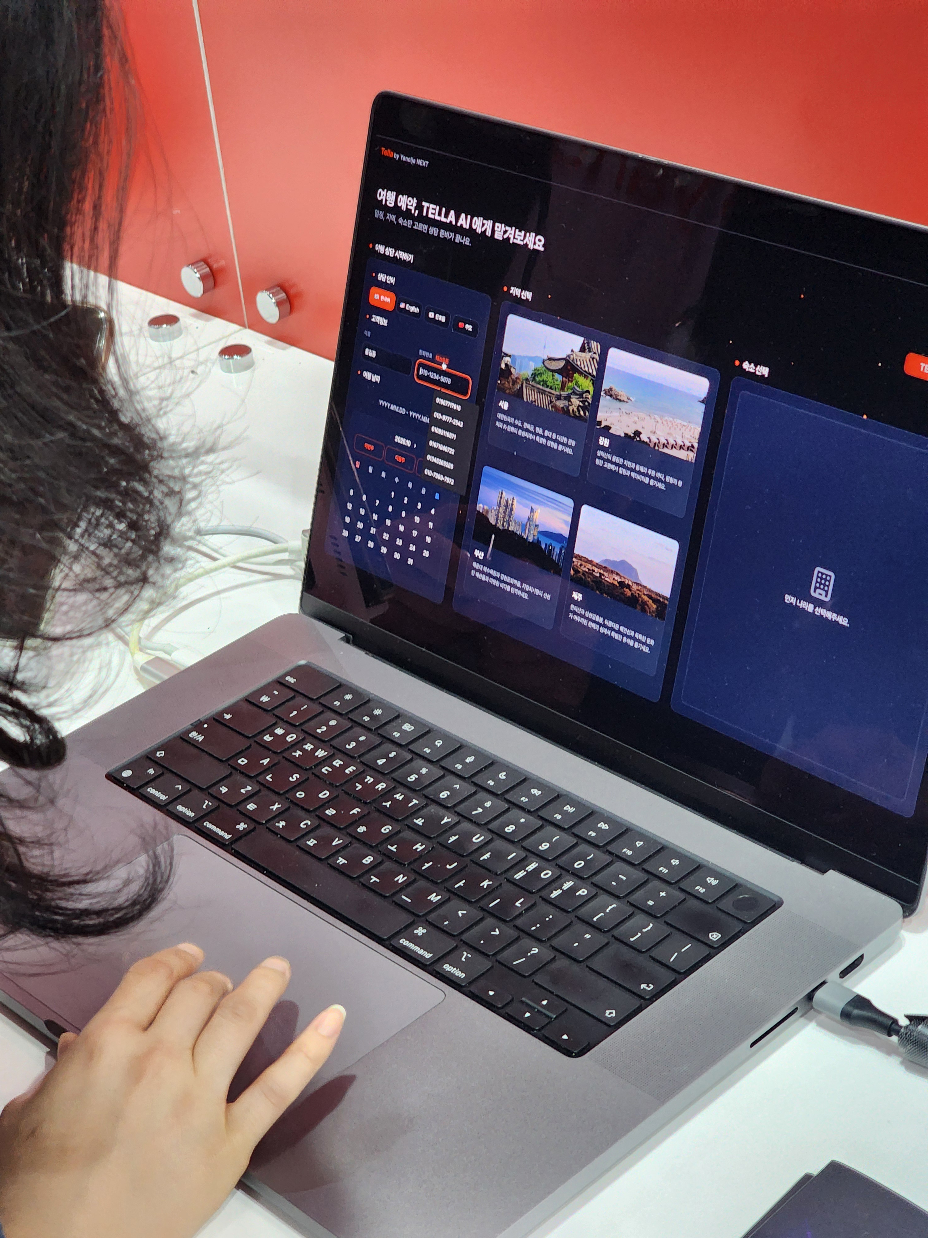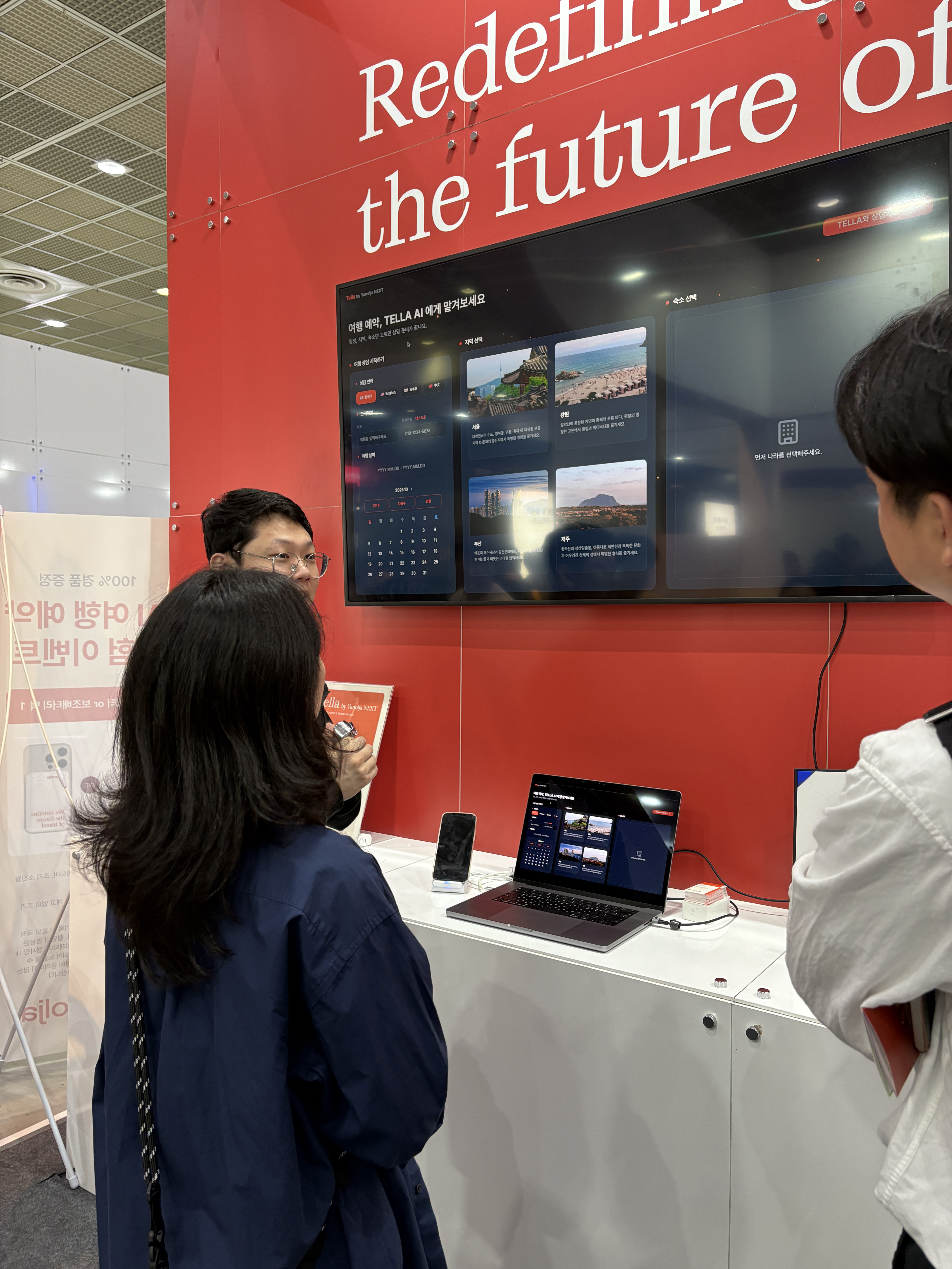 부스에서 가장 먼저 시선을 끈 건, 야놀자의 AI 음성 자동화 시스템 ‘Tella(텔라)’ 데모였어요.