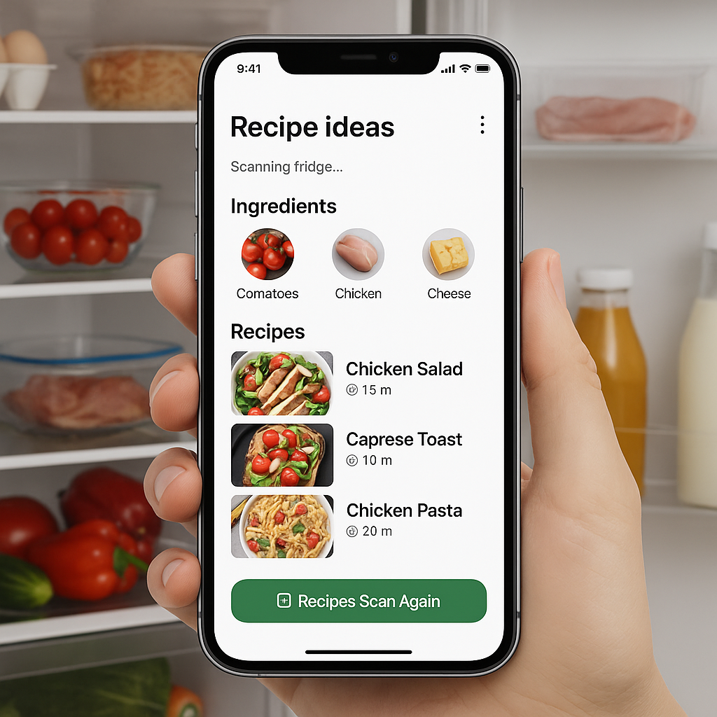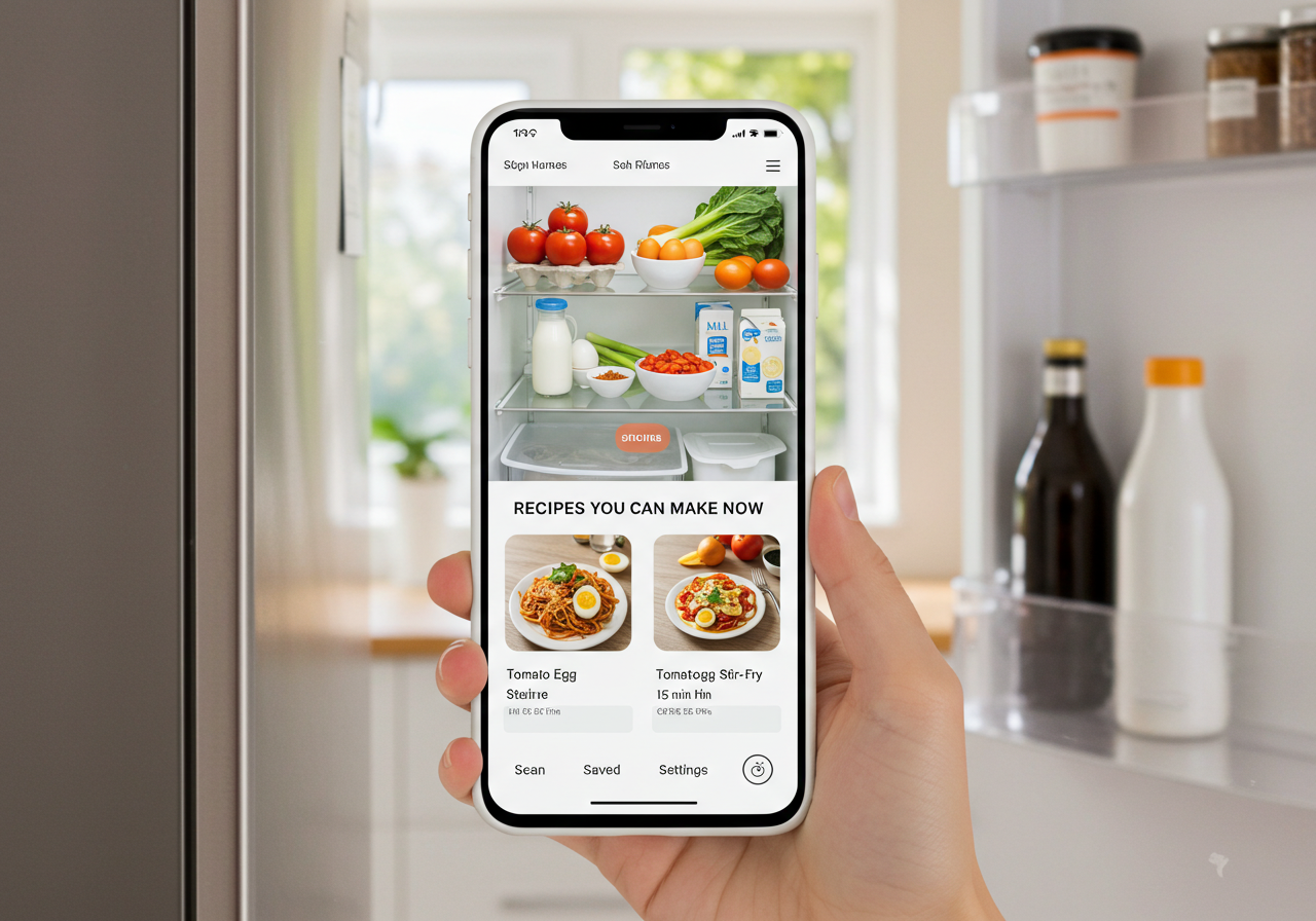 레시피 스캔(Recipe Scan)은 그런 순간에 스마트폰 카메라로 냉장고 속 재료를 스캔만 하면, 그날의 저녁 메뉴를 추천해주는 똑똑하고 실용적인 AI 기반 레시피 앱이에요.