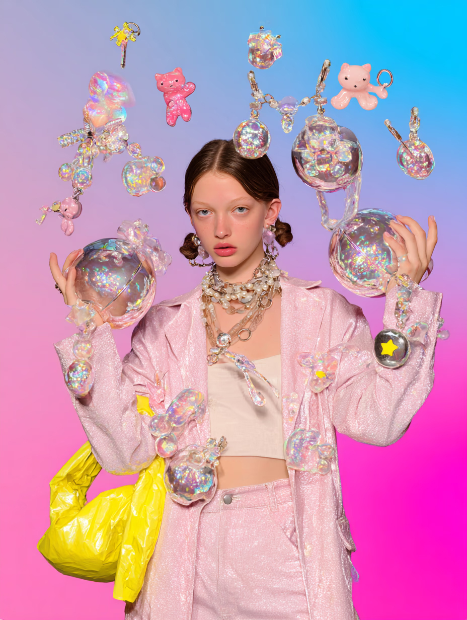 fashion model holding oversized glossy accessory in bright studio, surrounded by floating kawaii charms and keychains, pastel gradient background, Y2K editorial vibe, ultra glossy, high detail --ar 3:4 --profile zx8m5z6 iji3zcs --stylize 50.