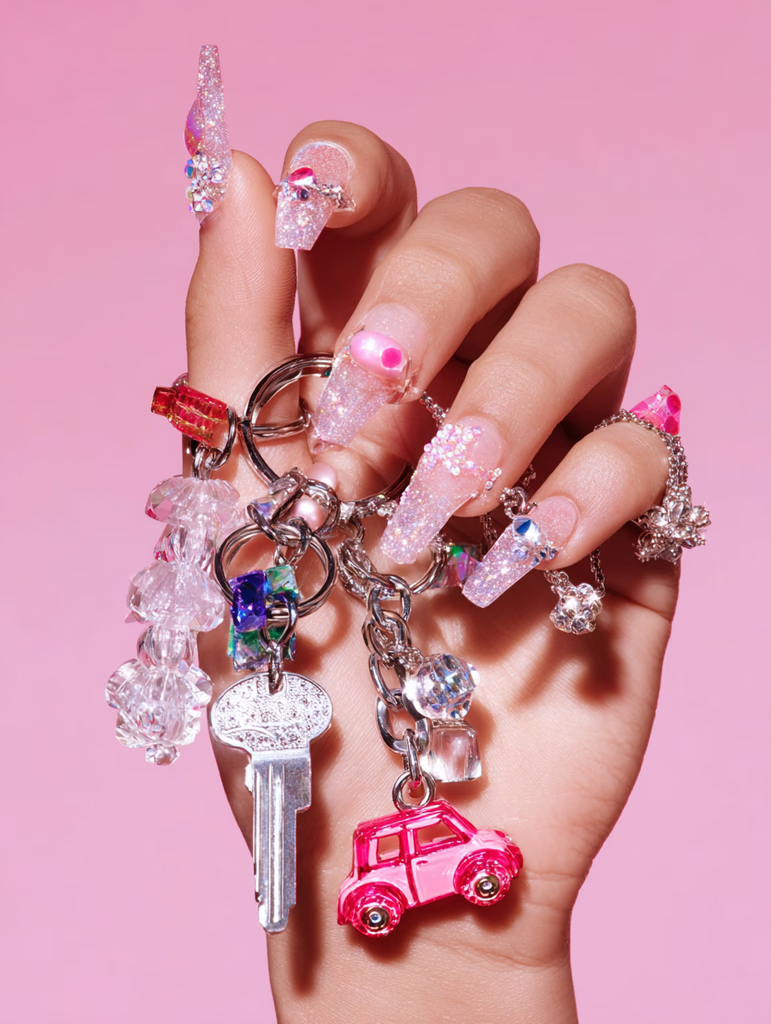 Close-up of a hand with glossy manicured nails, each decorated with dangling shiny keychains and charms, one oversized toy-like keychain filling most of the composition, bright saturated colors, polished 3D reflective textures, soft studio lighting, clean pastel background, high detail editorial style --ar 3:4 --profile zx8m5z6 iji3zcs --stylize 50.