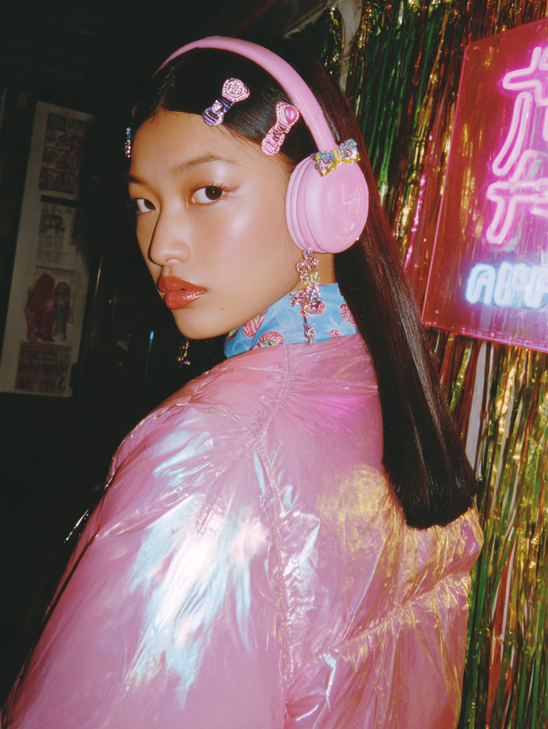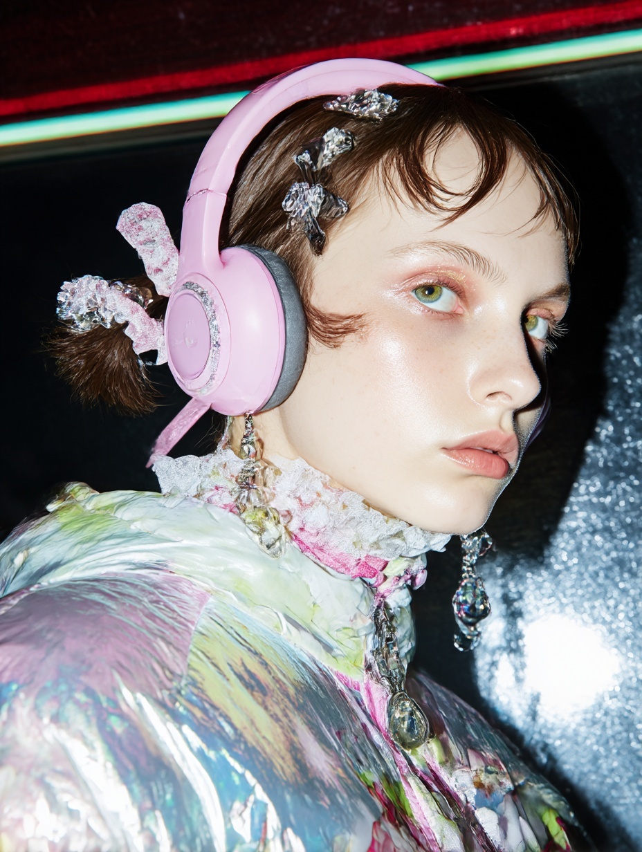 Over-shoulder shot of a model with candy-pink headphones, shiny hair clips, metallic jacket, focus on accessories, neon light reflection, futuristic Tokyo fashion look --ar 3:4 --profile 5dnojo1 tbzq1f3 --stylize 50.
