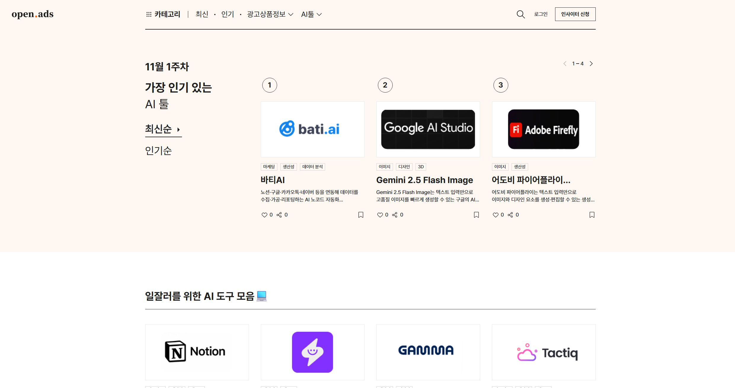 오픈애즈에서 만든 AI 디렉토리는 실제로 콘텐츠 기획, 마케팅, 디자인 실무에 바로 쓸 수 있는 AI 툴을 카테고리별로 정리해 둔 아카이브예요.