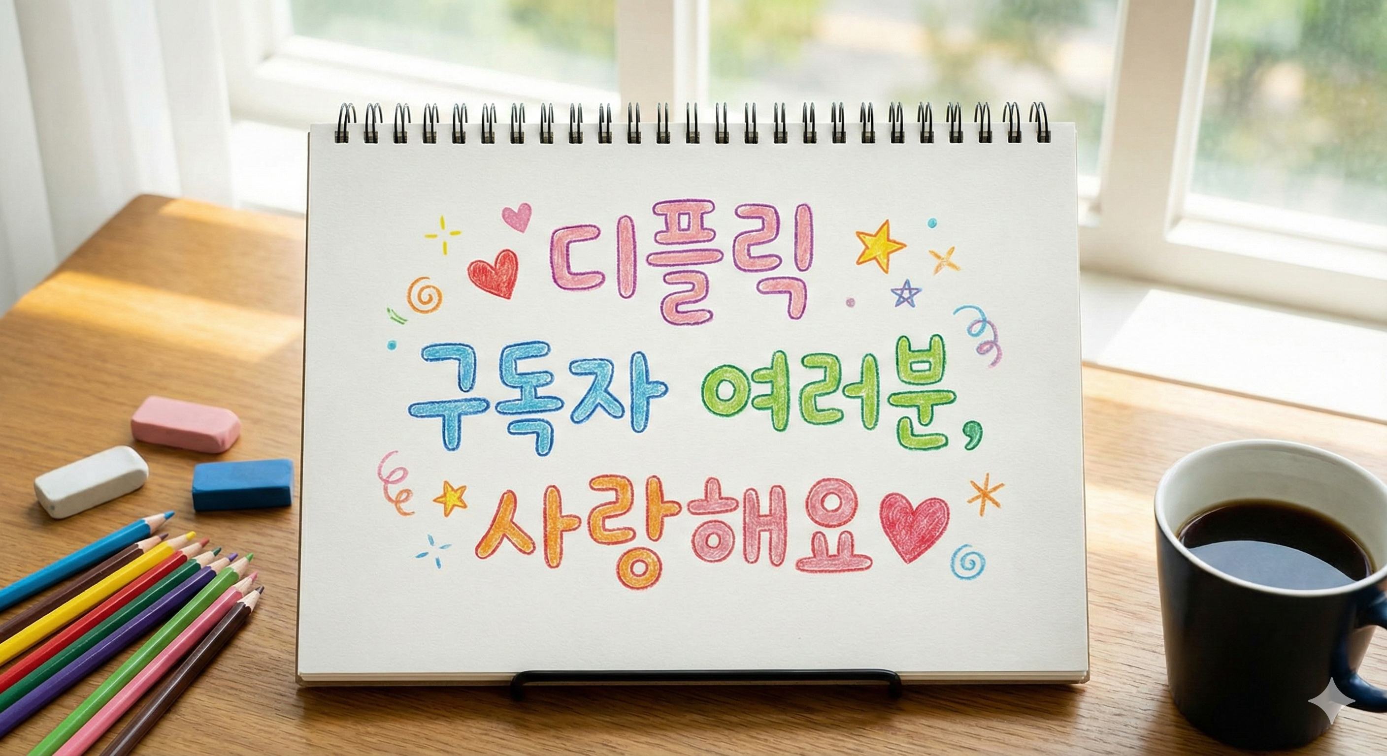 프롬프트: “‘디플릭 구독자 여러분, 사랑해요♥’ 라는 문구를 귀여운 손글씨로 스케치북 위에 적어주세요.”