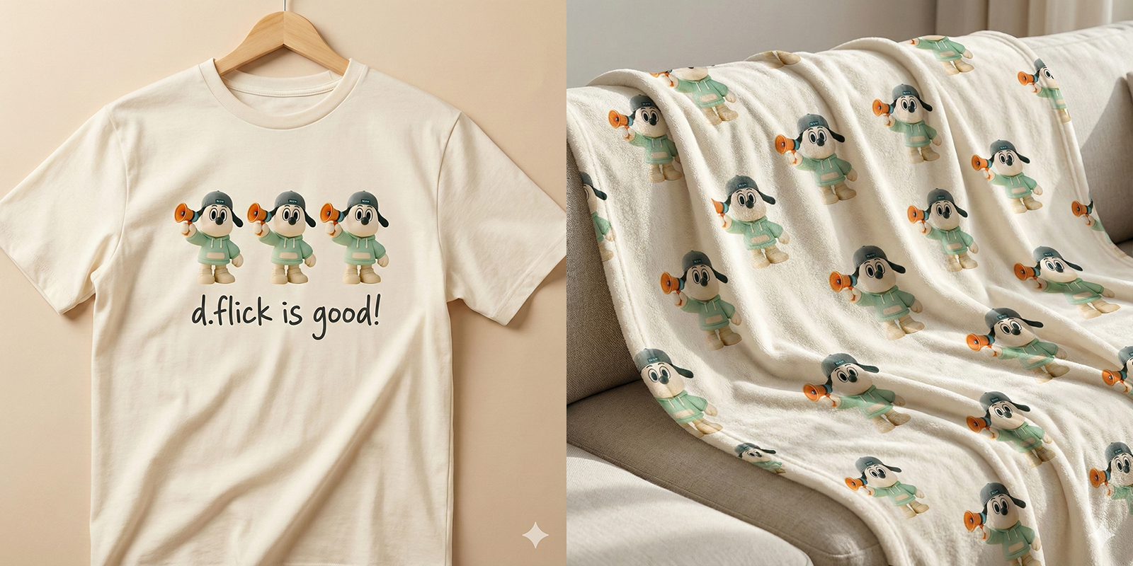 프롬프트: “이 캐릭터를 활용해 키링, 티셔츠, 담요에 인쇄된 목업 이미지를 1:1 사이즈로 제작해주세요.”