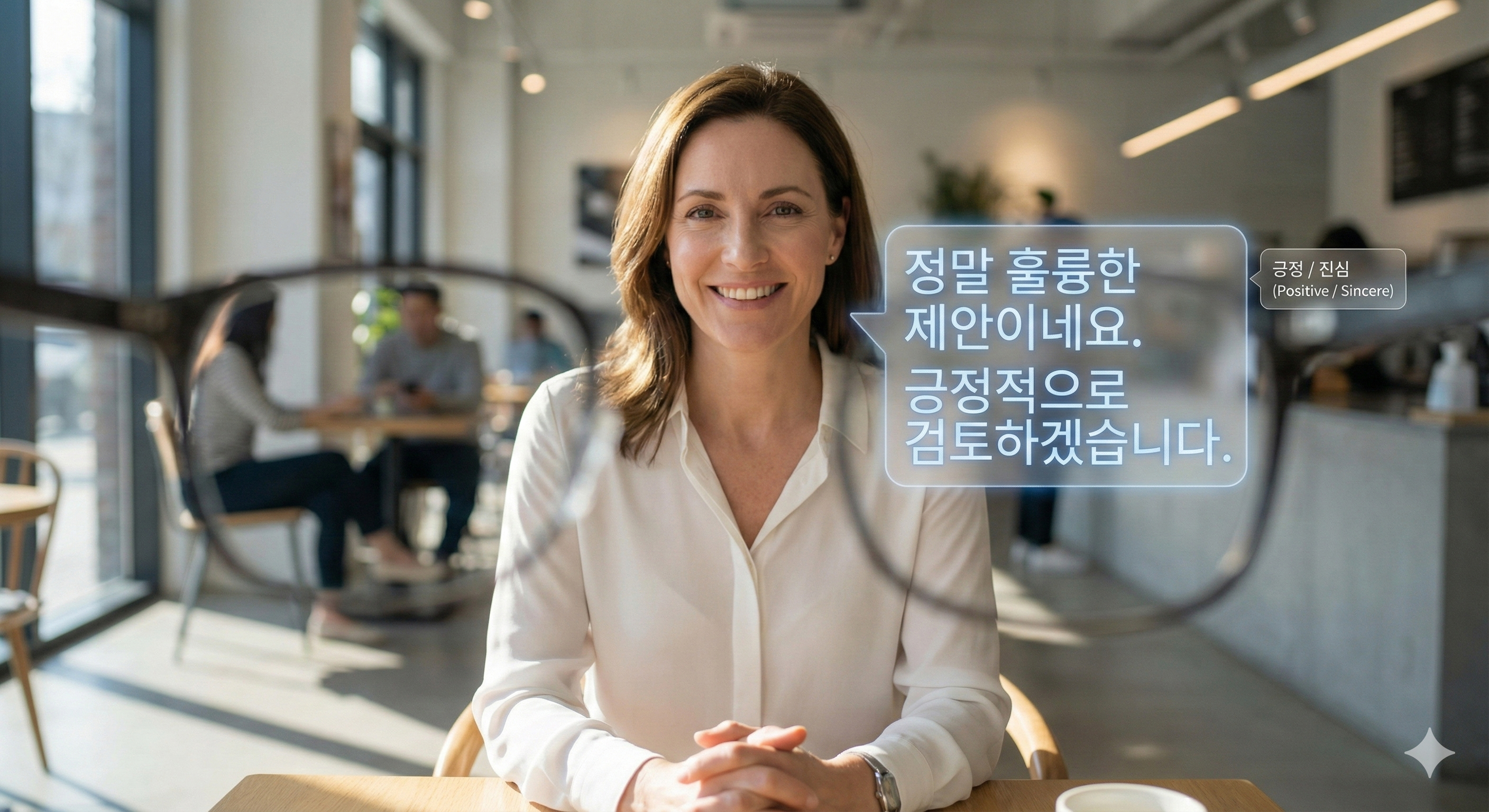 상대방의 언어를 자막으로 보여주는 것을 넘어, 그 이면에 숨겨진 ‘진짜 의도’를 증강현실(AR) UI로 시각화합니다. |