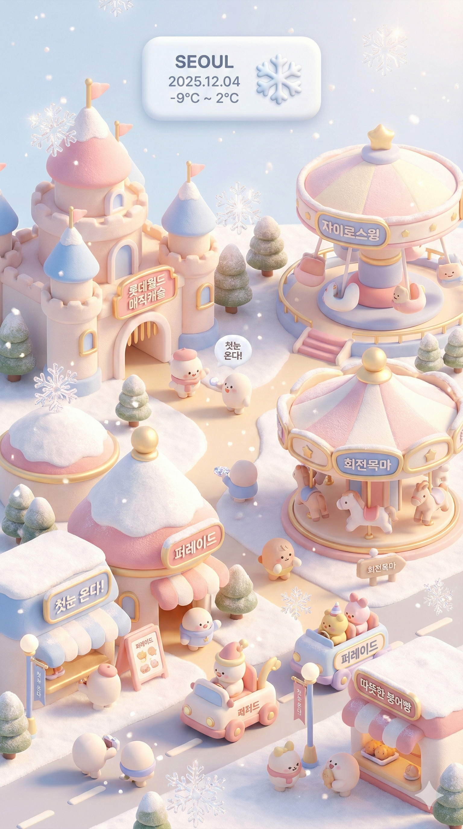 (9:16 세로 비율), 첫눈 오는 한국 놀이공원을 배경으로 한 귀엽고 부드러운 3D 미니어처 세상. 전체적으로 따뜻한 파스텔 톤의 장난감 세상처럼 보임.