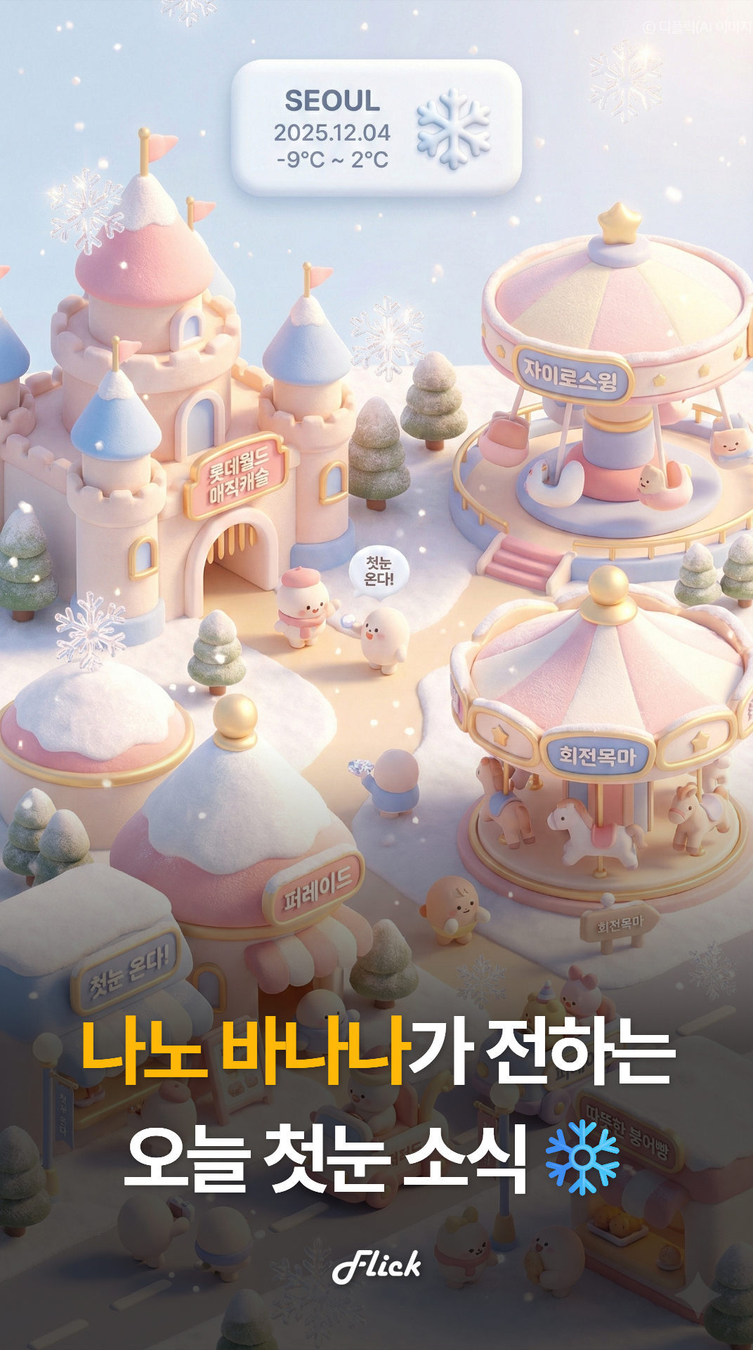 여기에 한국적인 요소(롯데월드, 한글 간판)와 첫눈의 설레는 분위기를 디테일하게 묘사했습니다.