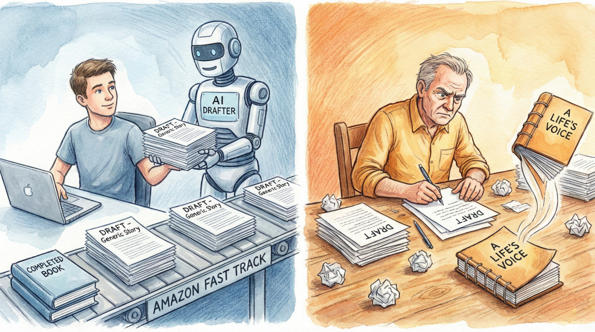 잘 쓰인 회고록 옆에 AI가 1분 만에 쓴 '가짜 전문가 가이드'가 나란히 놓여 있습니다.