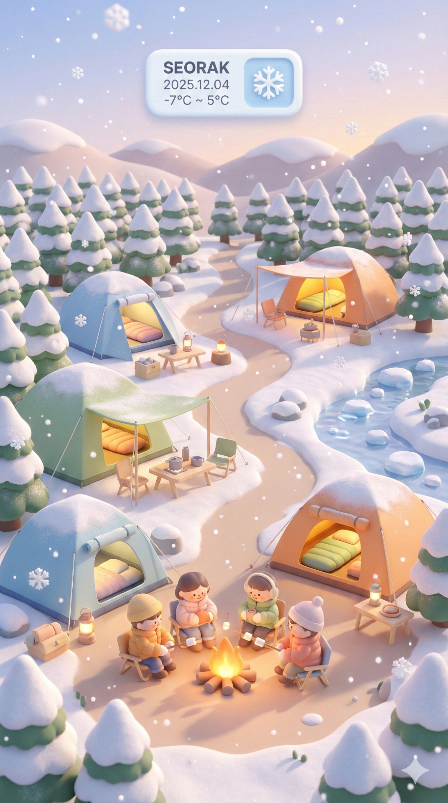 조명 & 분위기: 밝고 깨끗한 파스텔 조명(아침~오후), 눈에 반사되는 부드러운 하이라이트. 전체적으로 포근한 동화 같은 분위기.