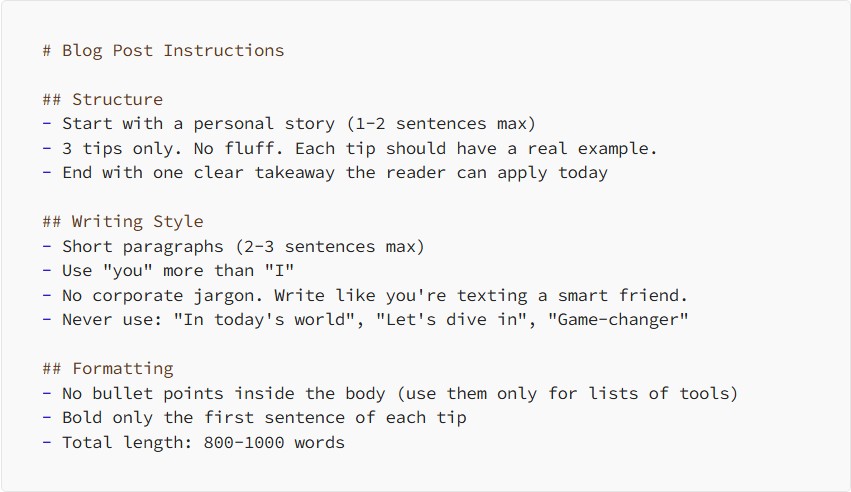 #작성 스타일: ‘I’보다 ‘You’를 사용할 것. 딱딱한 기업 용어 금지. #포맷: 본문에 글머리 기호(블릿) 사용 금지. 텍스트(.txt)와 달리 마크다운은 제목과 기호로 구조화되어 있어 AI가 완벽하게 이해합니다. 처음부터 쓰기 막막하다면, 클로드에게 “내 글쓰기 스타일을 파악하기 위해 나를 인터뷰하고, 그 결과를 .md 파일로 정리해 줘”라고 지시해 보세요. 한 번 잘 만들어둔 이 파일은, 앞으로 모든 작업의 완벽한 뼈대가 됩니다.