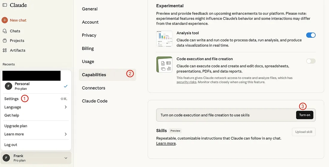 - 세팅 방법: Settings(설정) → Capabilities(기능) → Skills(스킬) 켜기